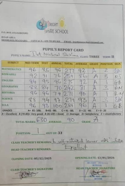 Kingston Frontenac’s sponsored student, Ilet Shirima, is doing very well, leading her class once again at the Bright Future School in Moshi, Kilimanjaro, Tanzania.