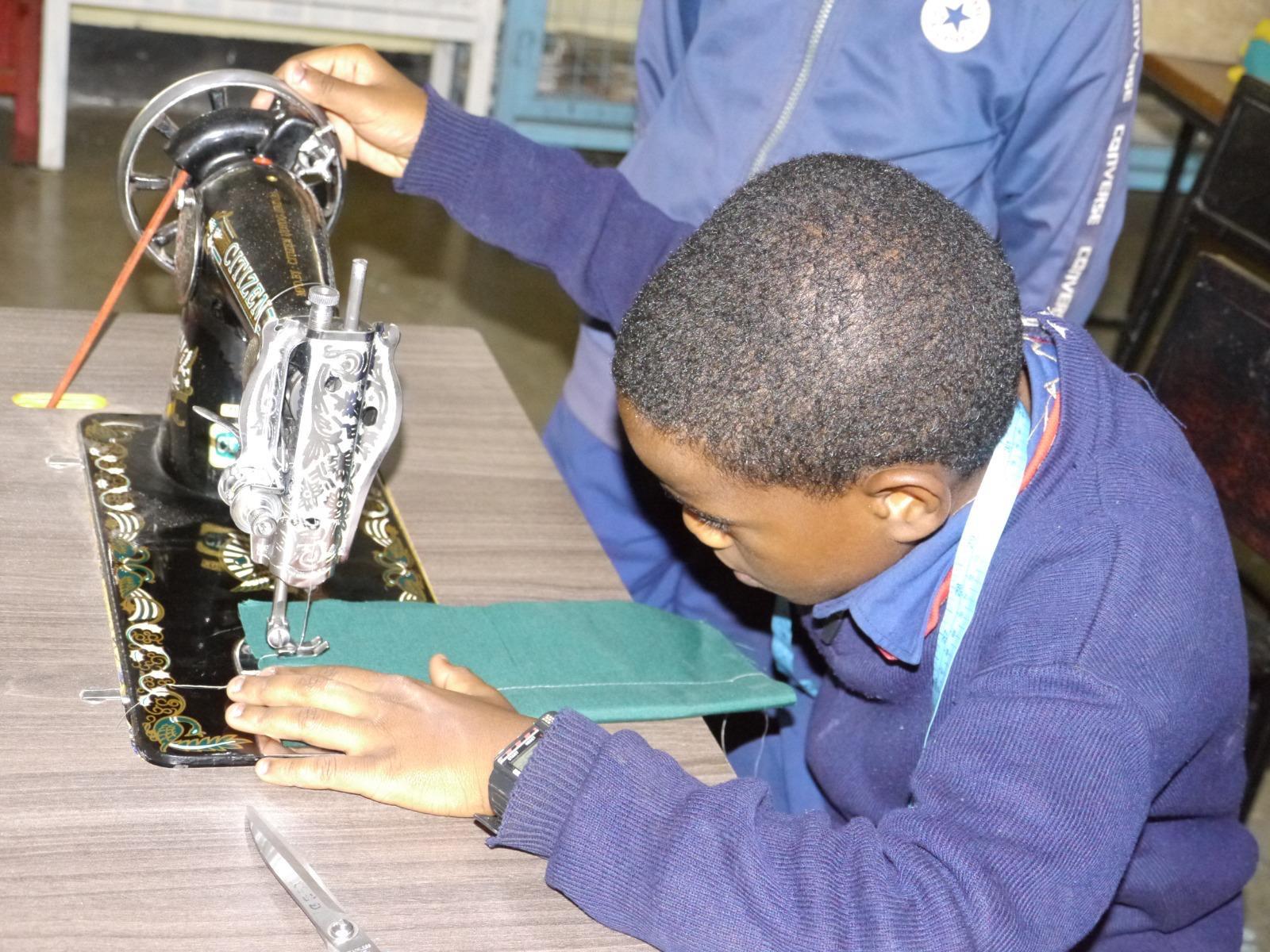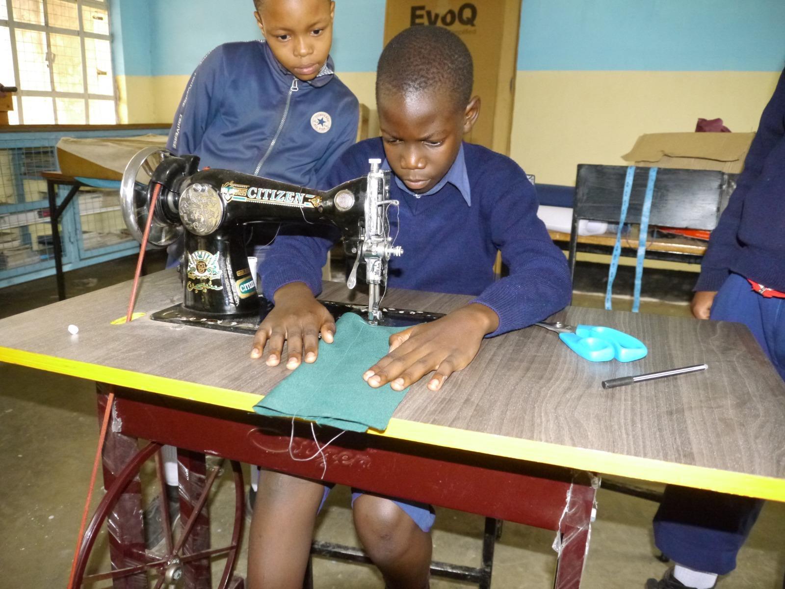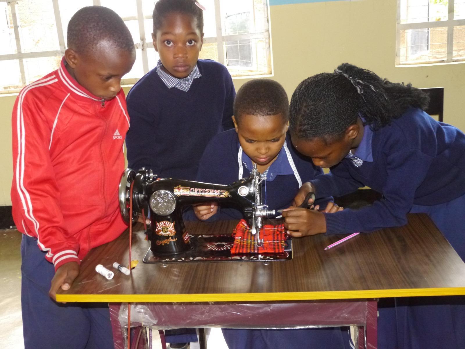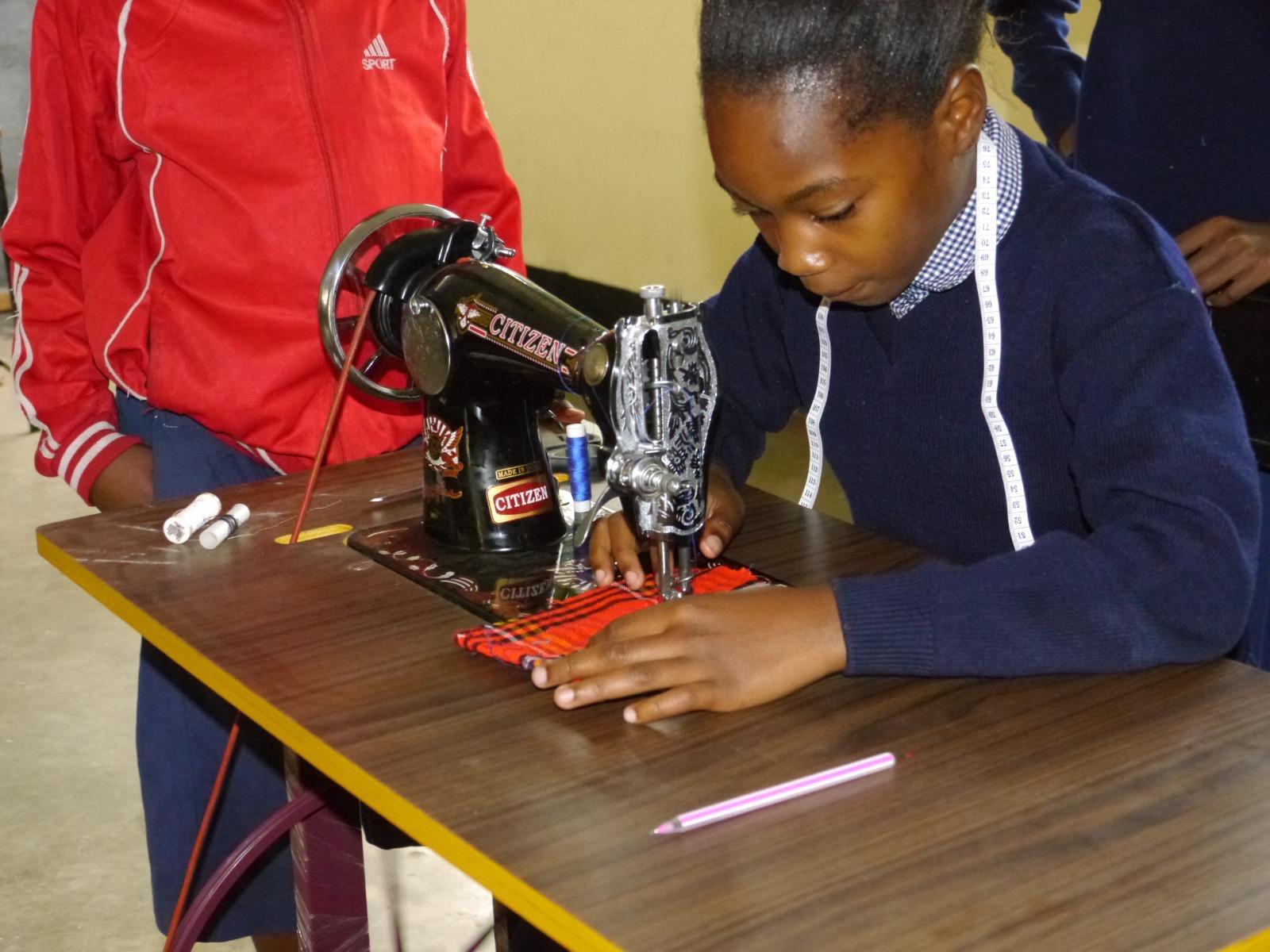 Mme Felister teaching the Maarifa Sewing program at Trinity Academy Students at work at Trinity Academy in the Maarifa Sewing Project (Tanzania)