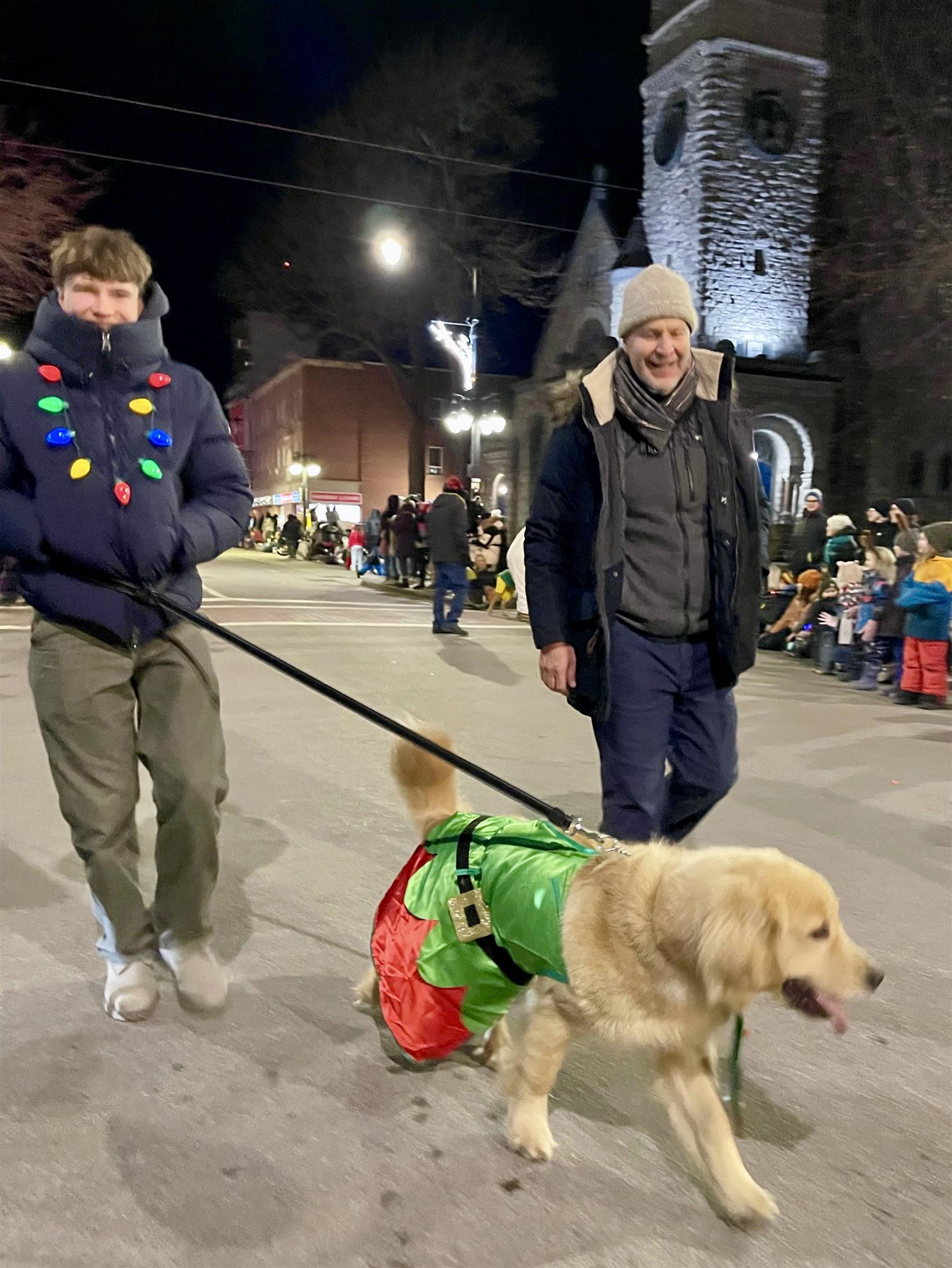 (F) - Decorated for the Holiday season in festive lights, Christian showed his spirit in the Kingston Nighttime Santa Parade together with host-family Dad Mauricio and Checo marching with the Groovytown Dog Lodge!