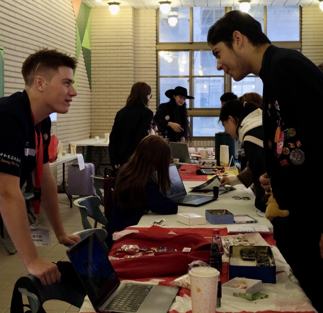 (C) - At an international student fair, Nico (L) explains life in Canada to Taiwanese students.